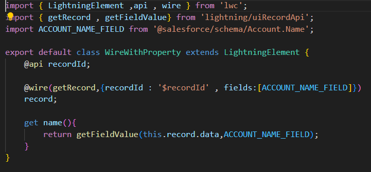 - getRecord , getFieldValue를 uiRecordApi로 부터 import한다