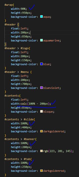 - 헤드에서 width : 100% 설정시 calc로 나머지 블록들 넓이설정가능