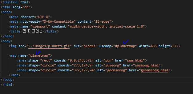 - 이미지 불러오고 맵이름 지정( <img src="../Images/america.png" alt="america" usemap="#america" width=799 height=493> )