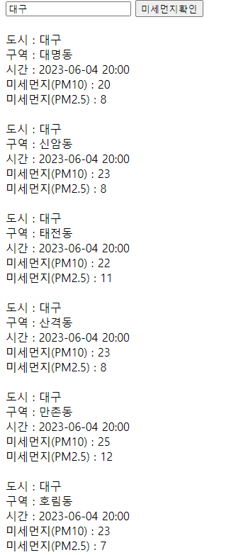 "미세먼지(PM2.5) : " + response.response.body.items[i].pm25Value + "<br><br>"