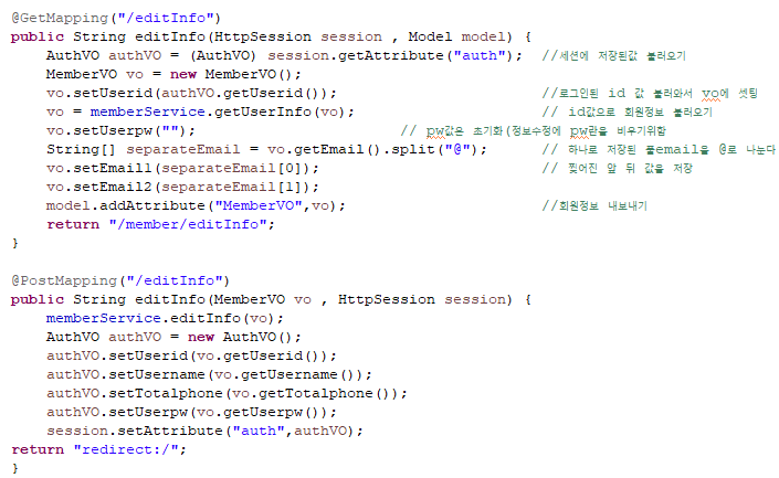 - 받아온 회원정보에 pw값 초기화(정보수정에서 pw란을 비우기위함) 및 email split(abc@abc형태로 저장되고있기때문) 해준 후 model에 값을 저장해서 페이지를 불러온다.