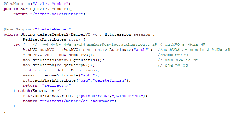 - id로 회원정보를 불러온 후 비번확인해주고 일치한다면 deleteMember 실행(회원가입과 유사하다)