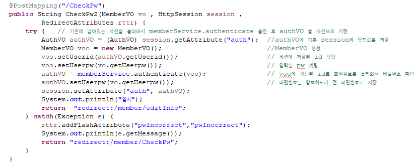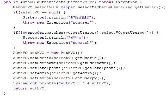 - MemberVO를 만들어 id(session)와 pw(입력된값)을 set한 후, authenticate로 백엔드의 값과 비교