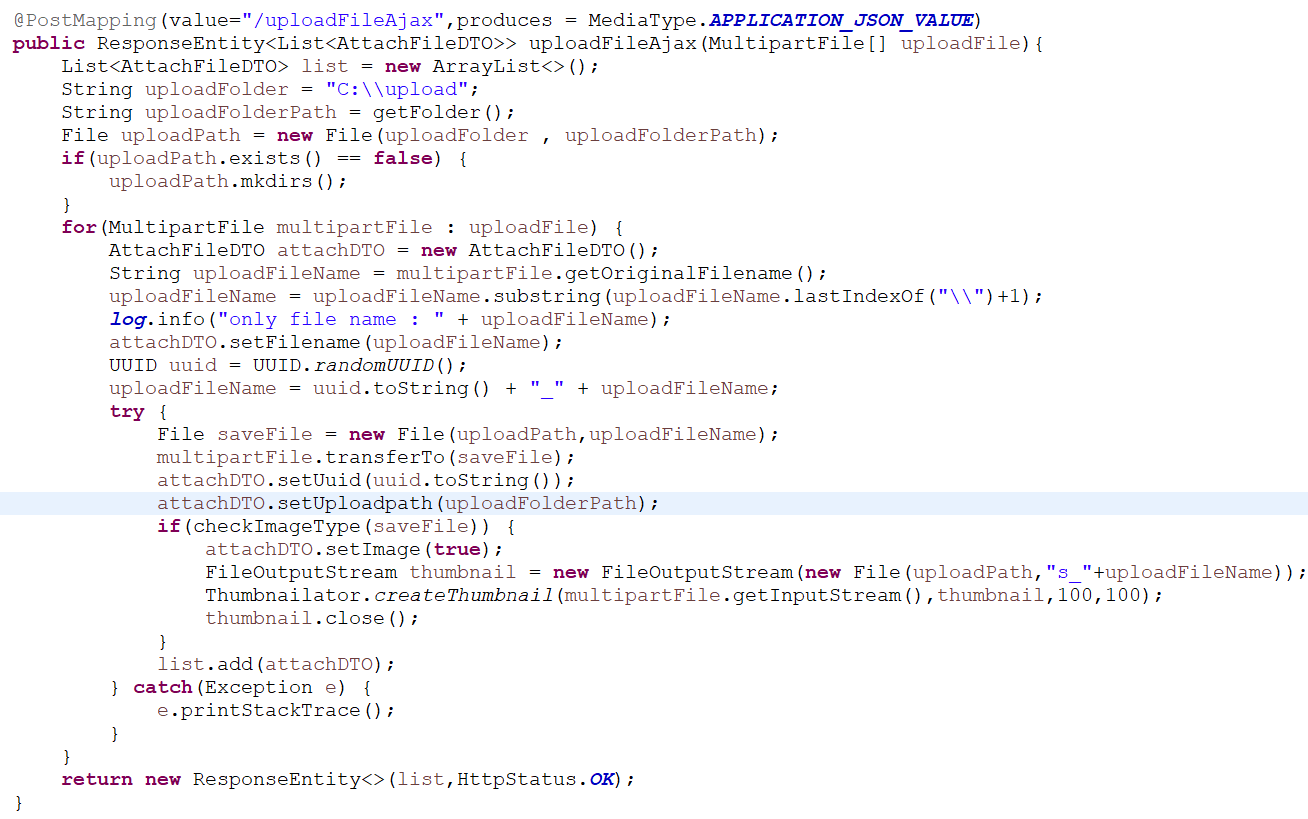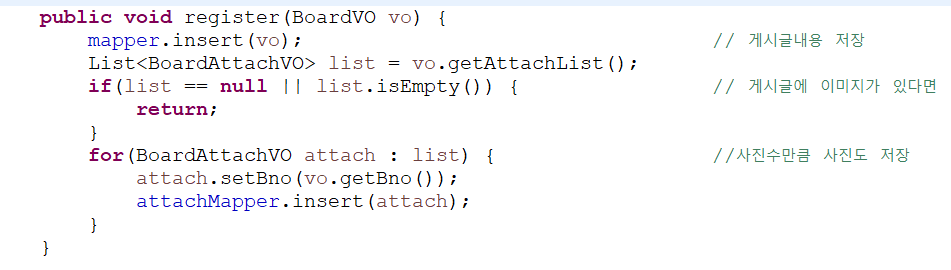 즉 게시물에서 제목,내용,작성자,파일정보(uuid,uploadpath)등을 받아와 mybatis로 백엔드에 저장합니다.