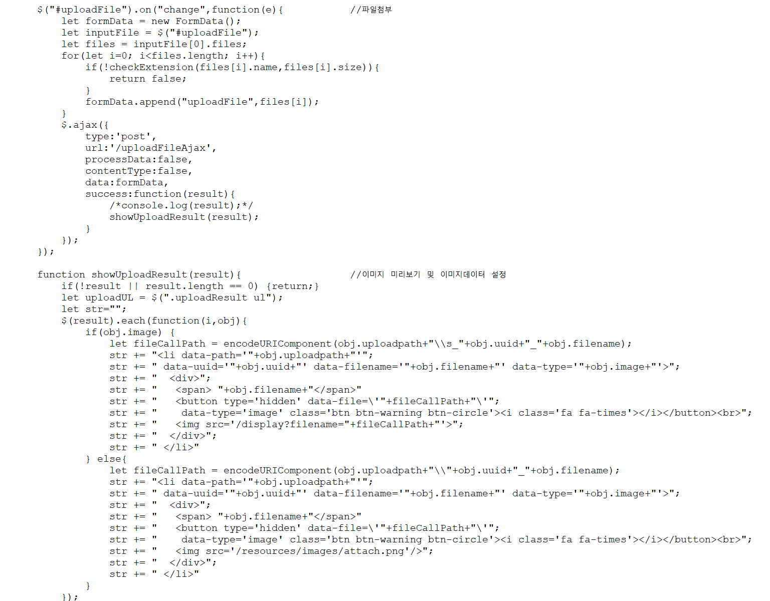 - 첨부되는 파일들을 c:\\upload폴더에 저장하고 showUploadResult에서 미리보기로 보여준다.