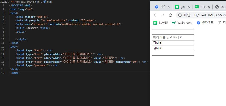 - <input type="text" placeholder="아이디를 입력하세요" value="김대리" maxlength="10"/> //글자수제한